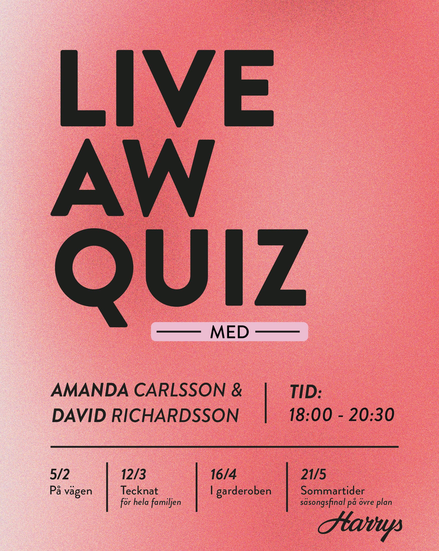 Välkommen till våra fantastiska Live quiz med Amanda Carlsson på sång och David Richardsson på piano och sång.